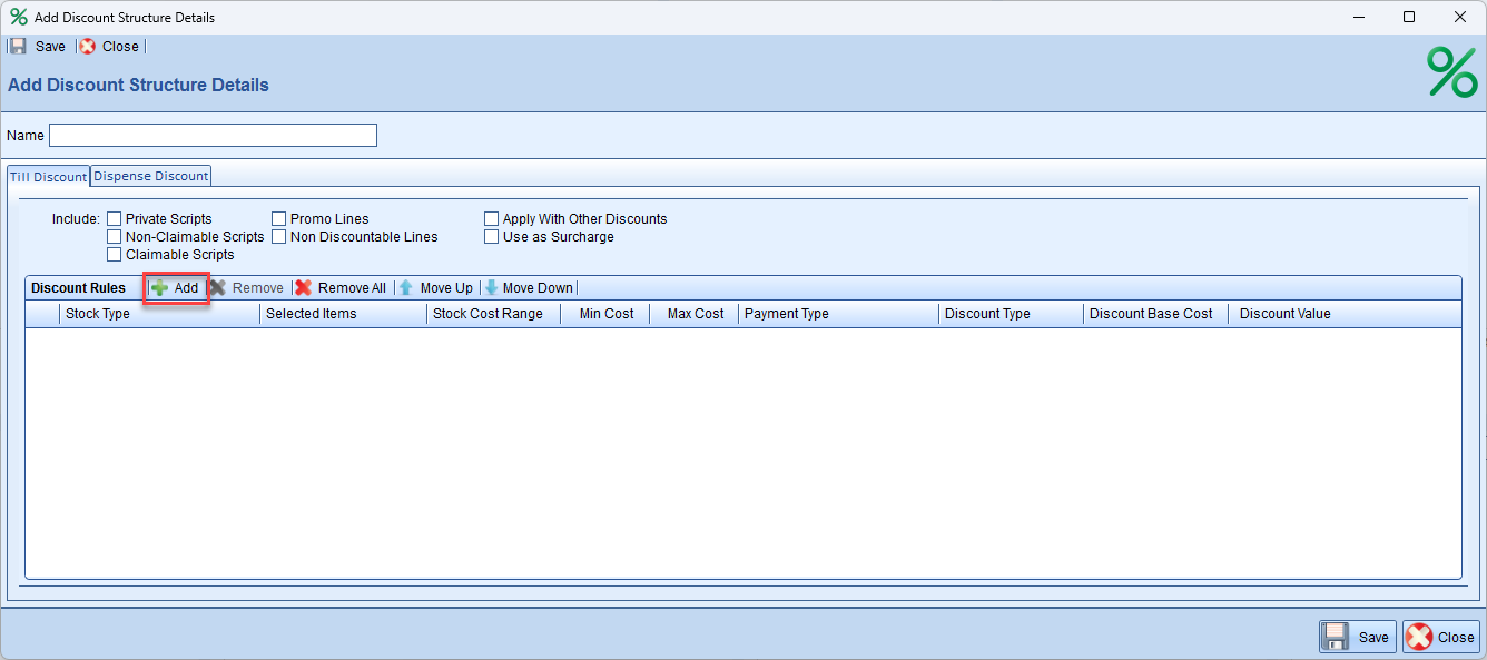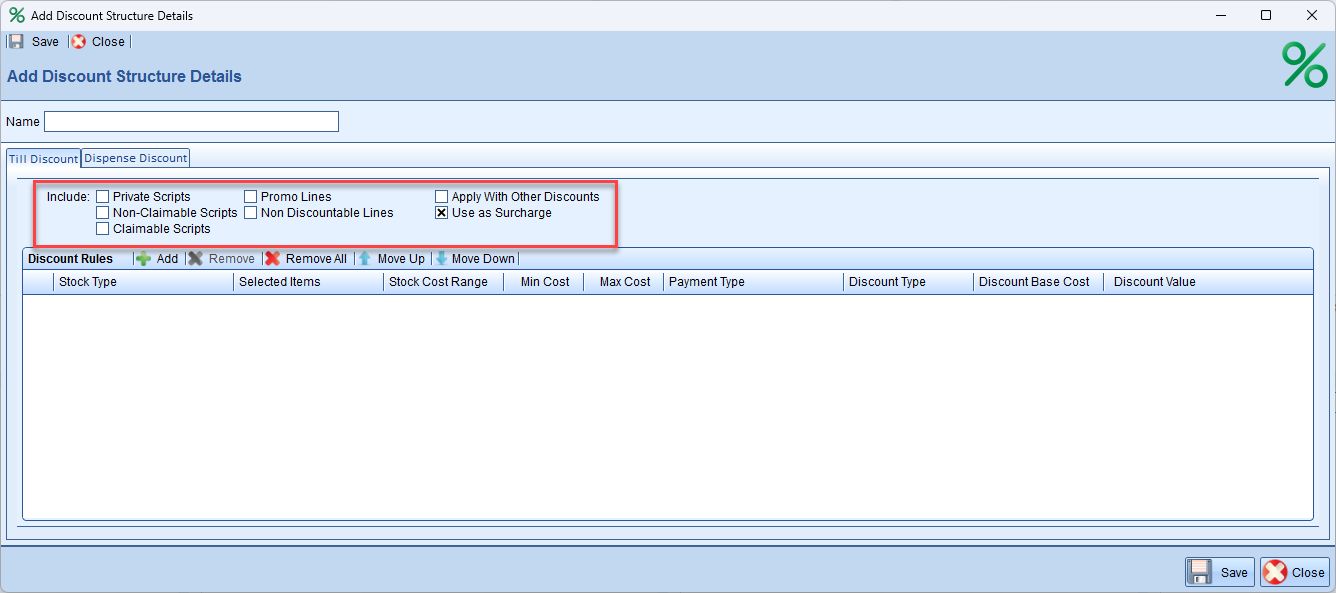 Discount Structure - This method allows you to exclude claimable prescription items from applying surcharges due to imposed restrictions. However, this method will apply the surcharge applied individually across each item on the receipt.