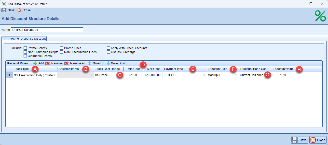Allows you to specify which stock type the rule applies to e.g. prescriptions vs FOS stock.If you do not want to add a surcharge to claimable scripts, please ensure 'Prescription Only (Claimable PBS)' is not ticked.If you have chosen stock group for your stock type, you can specify the group here.Select the price filter you would like to use.e.g. select 'Sell price' if you would like to only apply the rule for items with a sell price greater than $10Set the range for the price filter.e.g. set Min Cost to $10 to only apply the rule to items above $10This allows you to set the different payment methods where the rule will apply.Set this to Markup $ or Markup % to apply a surcharge.Any percentage changes will use this selected value for calculations.We recommend you use 'Current Sell Price' to apply calculations correctly to promo items.This is the surcharge value in $ or %.