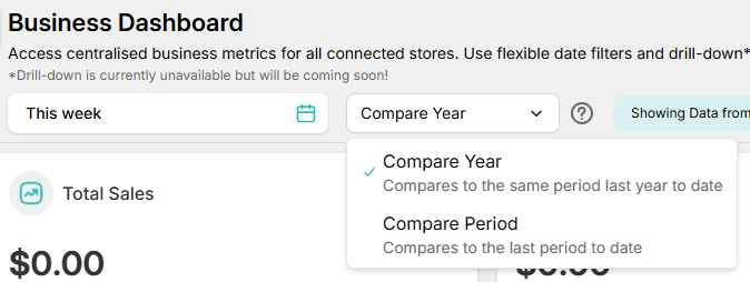 | Compare Period | This compares to the last period to date. This is more applicable for the Month, Week and Day options as for the Year options, the last period is the same as the Same Time Last Year (To Date) option. | 2025 Comparing last period, 2024 to date) vs 2025 to date: 2024: 01/01/2024 - 28/08/2024 2025: 01/01/2025 - 28/08/2025 Month Comparing the last period (July 2025 to date) vs August 2025 (to date Jul 25: 01/07/2025 - 28/07/2025 Aug 25: 01/08/2025 - 28/08/2025 |