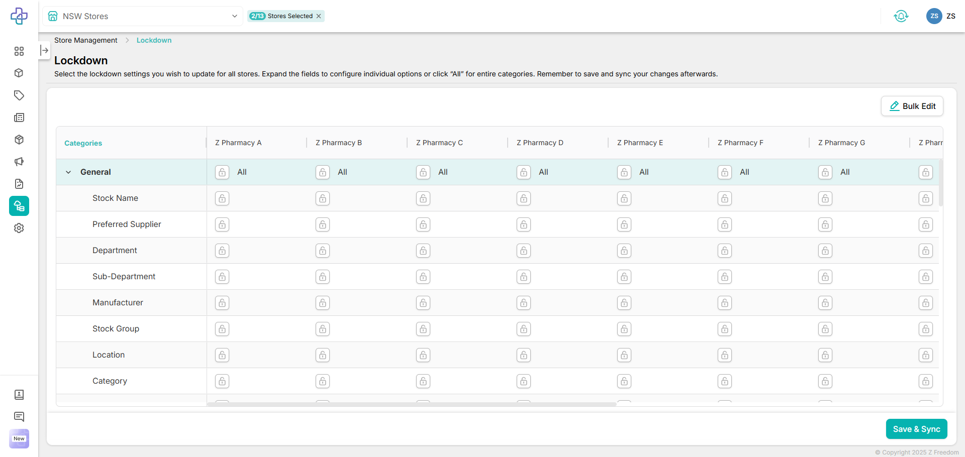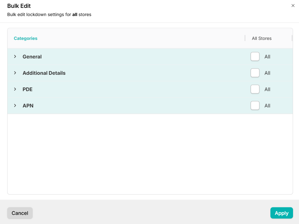 If you'd to to set the lockdown fields in bulk, you can use the Bulk Edit button to manage multiple settings for all stores: