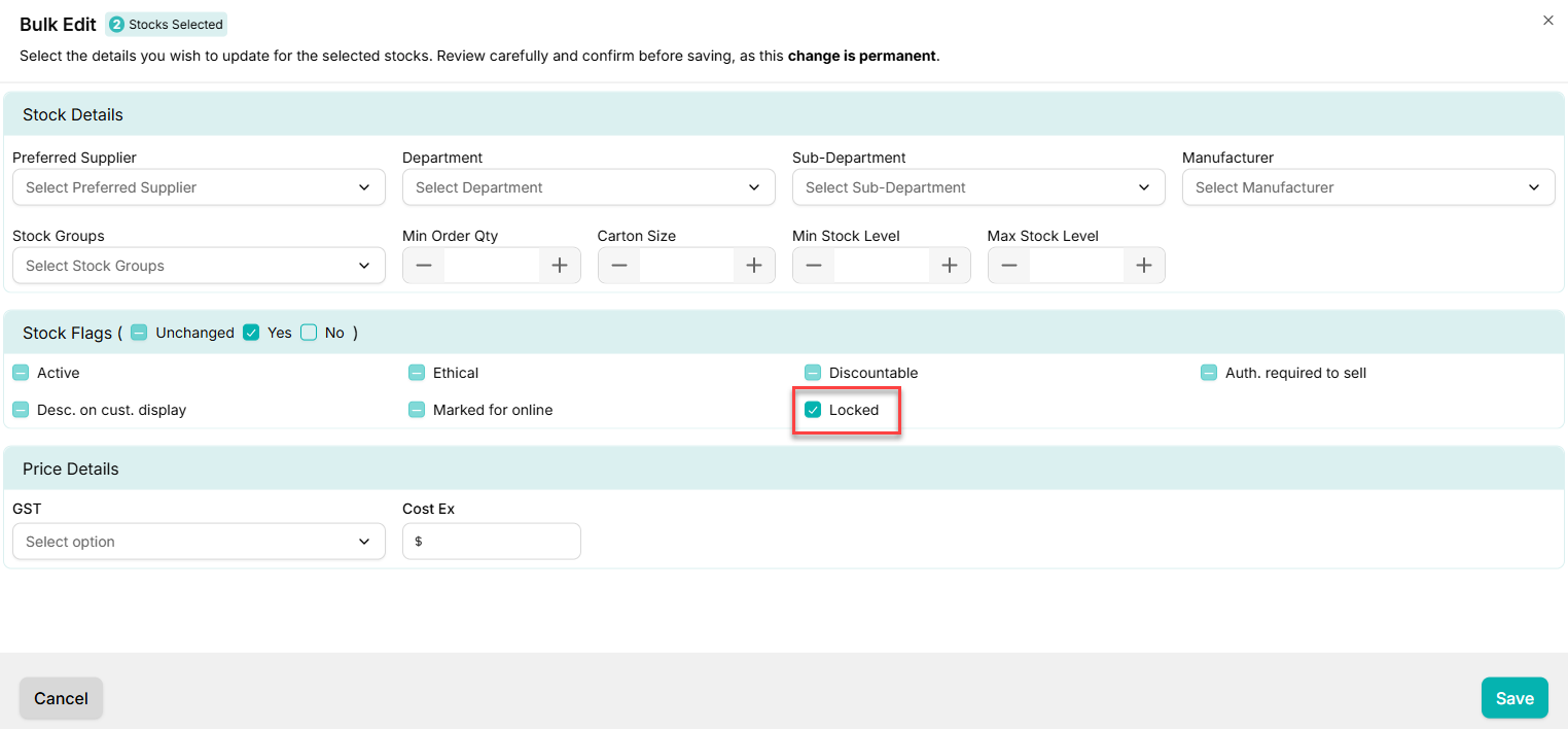 - Under the Stock Details > Stock Flags section, tick the Locked option: