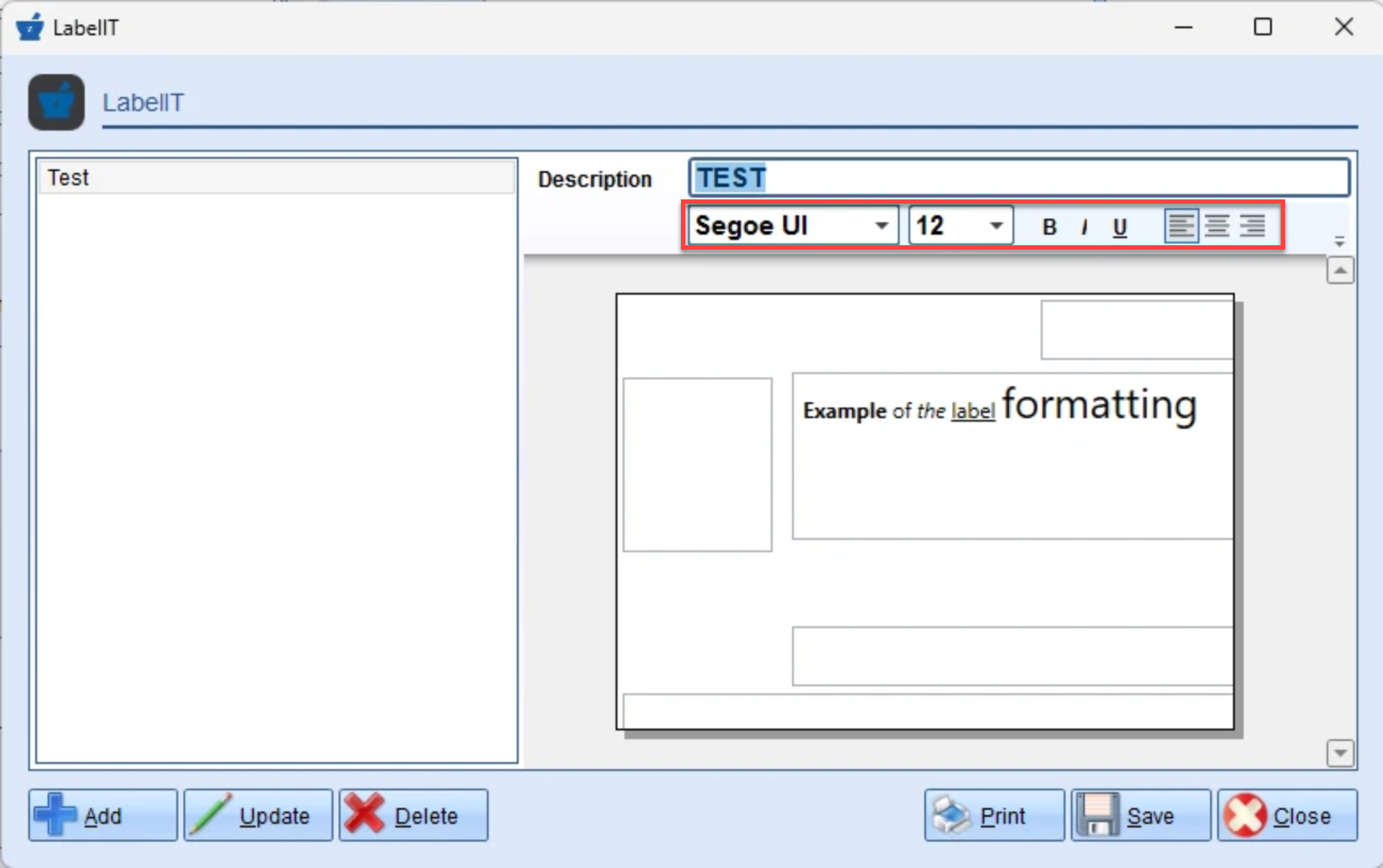 Option to change text formatting in LabelIT You have the option to change text formatting in LabelIT.The font, size, style (bold, italics and underline) as well as the alignment of text can all be adjusted:To change the text formatting in LabelIT, go to Z Dispense > Tools > LabelIT. Comments 0 comments Please sign in to leave a comment.